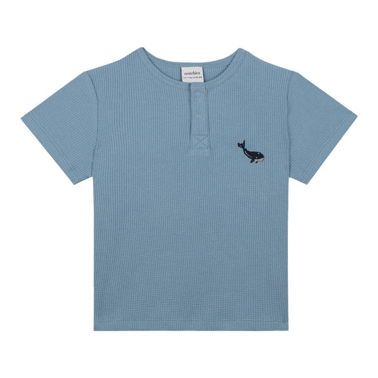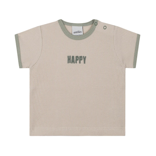 Beige Waffle Tshirt + Pants Set with Green Contrast and Happy Embroidery