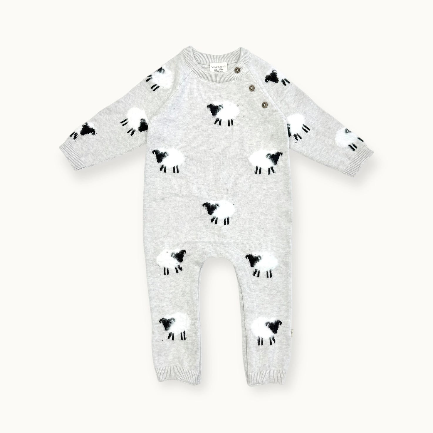 Premium 100% organic cotton baby sweater jumpsuit featuring charming furry sheep jacquard design with applique and embroidery details. Crafted for exceptional comfort and style.