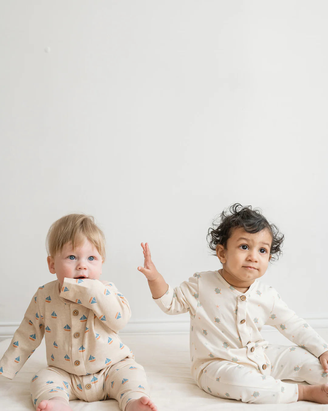 Available in sizes Newborn through 12–18 months, featuring our playful hand-drawn sailboat print—perfect for seaside dreams and cozy cuddles.