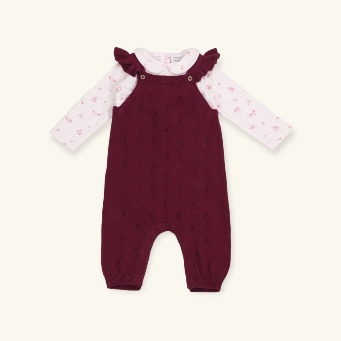 Elevate your little one's wardrobe with this charming ruffle knit overall and floral Peter Pan bodysuit set. Crafted from premium organic cotton, this adorable two-piece outfit combines comfort with timeless style.